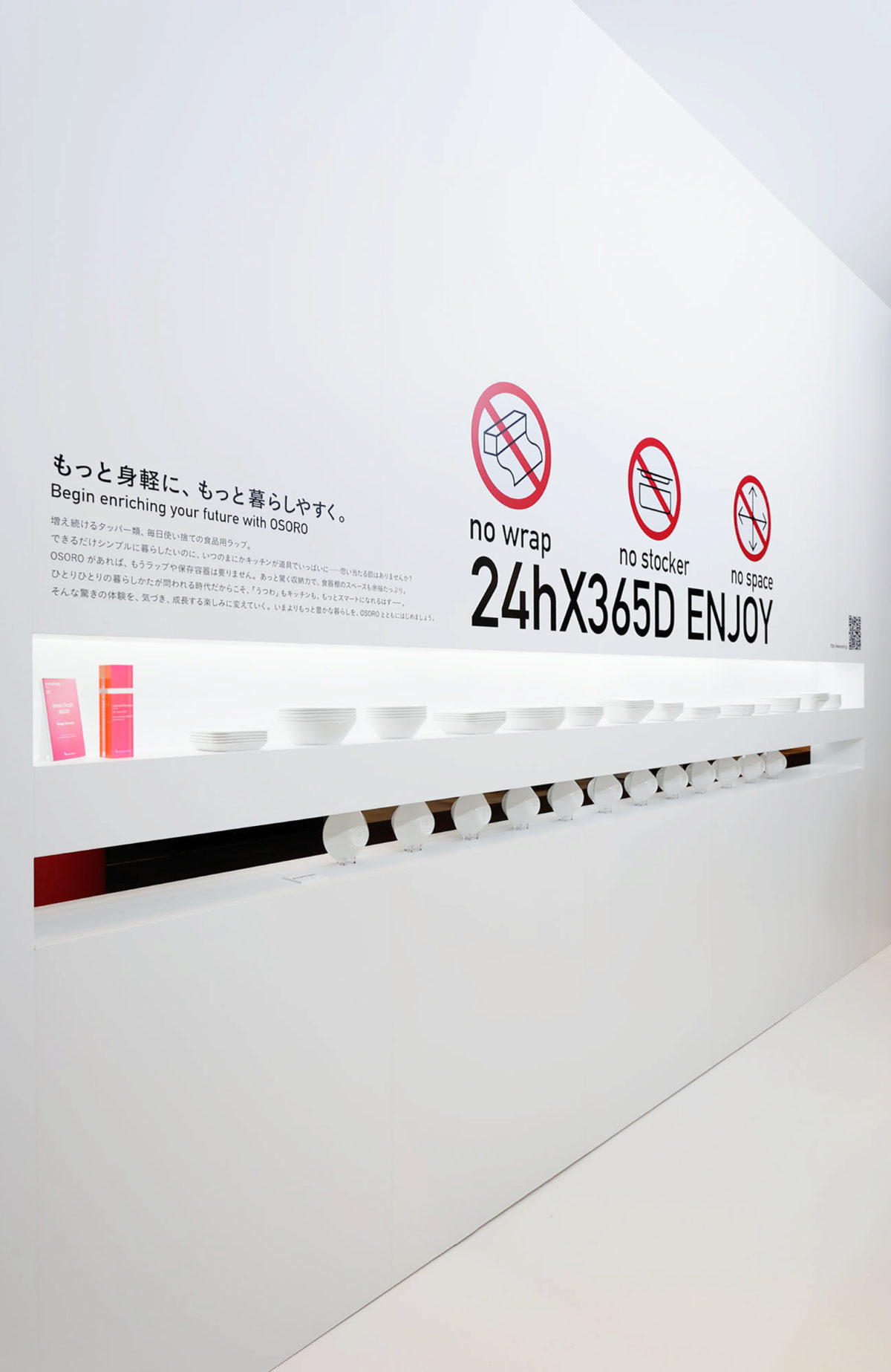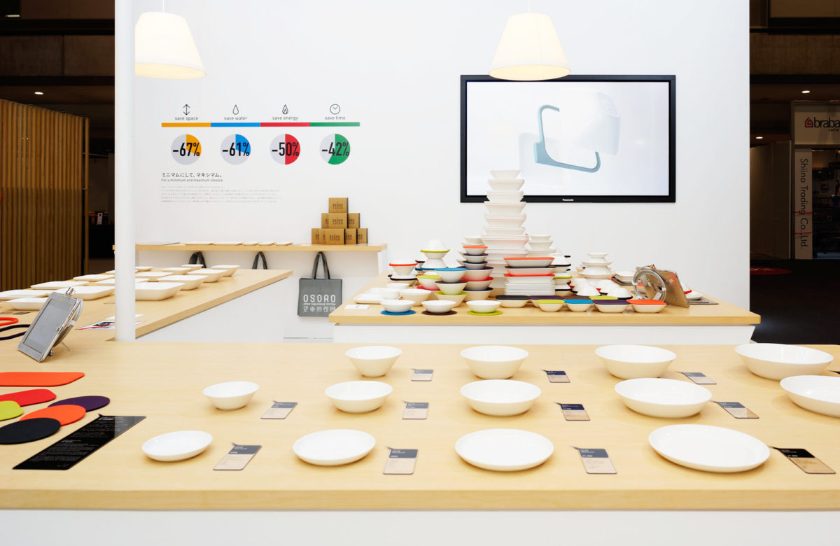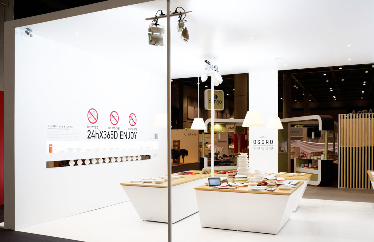 インテリアライフスタイル展2012『鳴海製陶器株式会社 OSORO Booth』いま、「うつわ」にできること。OSOROはこの問いかけから生まれた。 ラップを使わずに冷凍もレンジ調理も可能。さらに抜群の収納力も兼ね備えた、シンプルかつ多機能で新しいうつわはボーンチャイナの伝統によるもの。アイデア次第で変化する、プロダクトの持つ多彩な使い道は、シンプルなサインピクトによって簡潔に表現。 興味を惹く親しみやすいピクトと、スマートな商品特性を持つ優れたプロダクトに寄り添う、ムダのないシンプルな空間とした。 インテリアライフスタイル展2012 デザインビジネスアワード 受賞 2013年 DSA賞 受賞