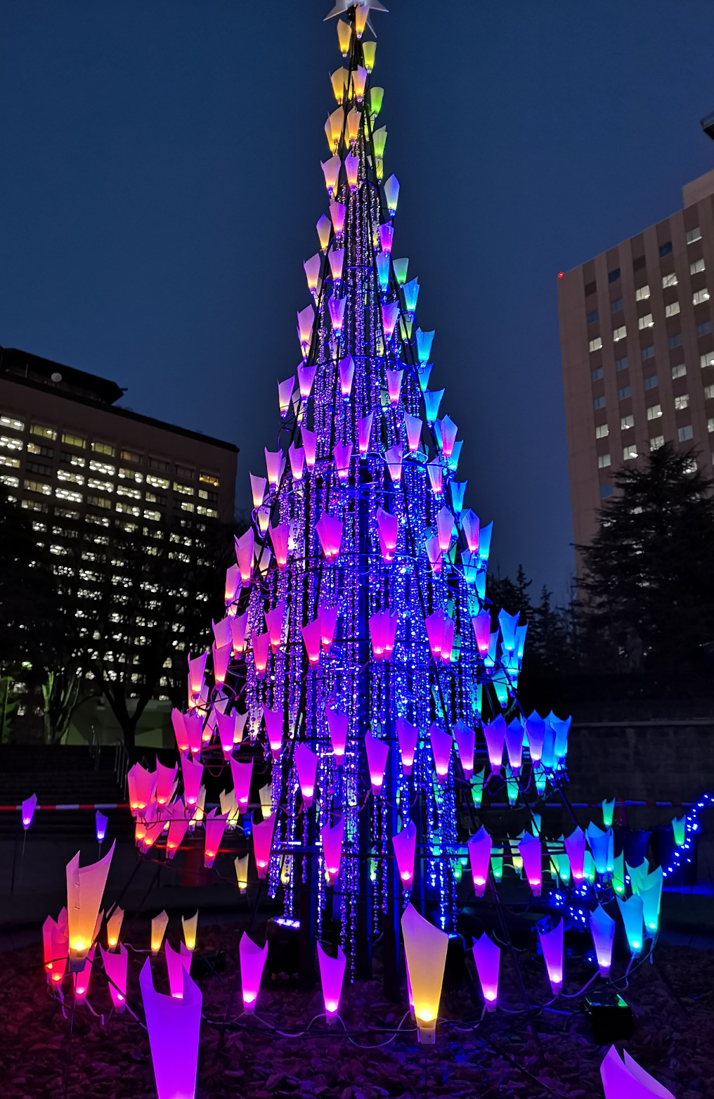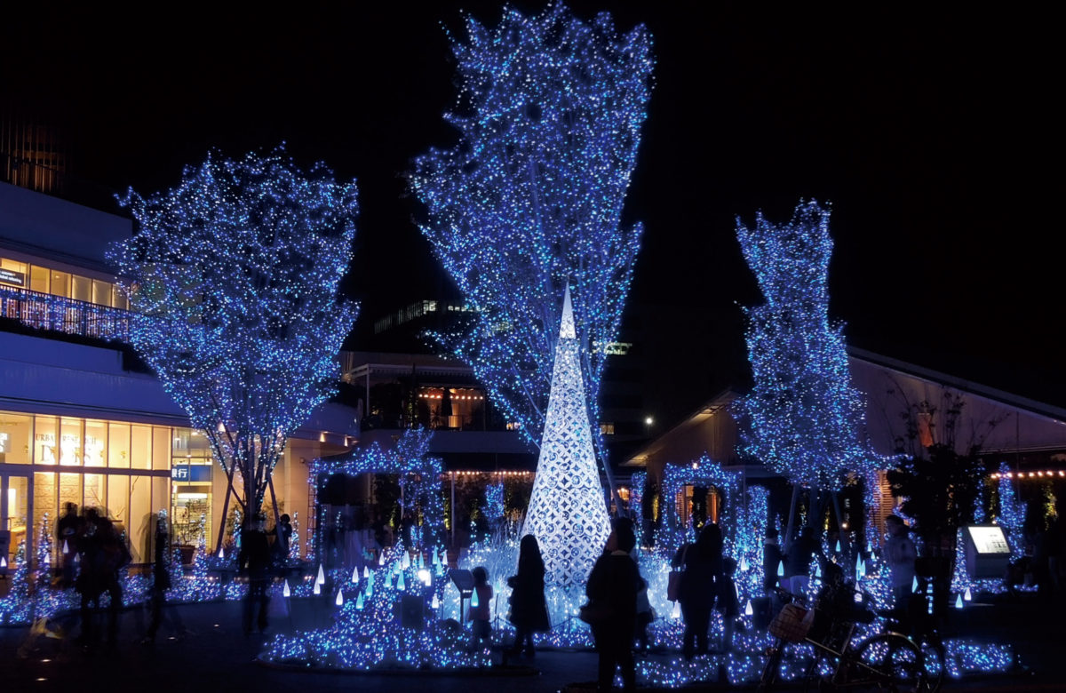 テラスモール湘南『Xmas Illumination 2011-2018』 -othersー SENDAI光のページェント『勾当台フラワーガーデン』 杜の都仙台の四季折々の豊かな自然風景をフルカラーに輝く『RGB光の花』で表現。若葉が芽吹き、やがて色鮮やかな花が咲き乱れる春、夏色に輝く森と青く澄み渡る海と空、紅葉に色づく秋や、スターダストのキラメク雪景色の冬等、プログラム制御で多彩に演出。 『RGB光の花』で組み上げたフラワーツリーをシンボルスポットとすることで、一体感のある豊かな自然の情景を色鮮やかに創出した。