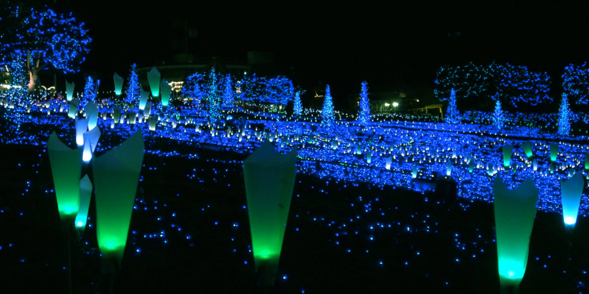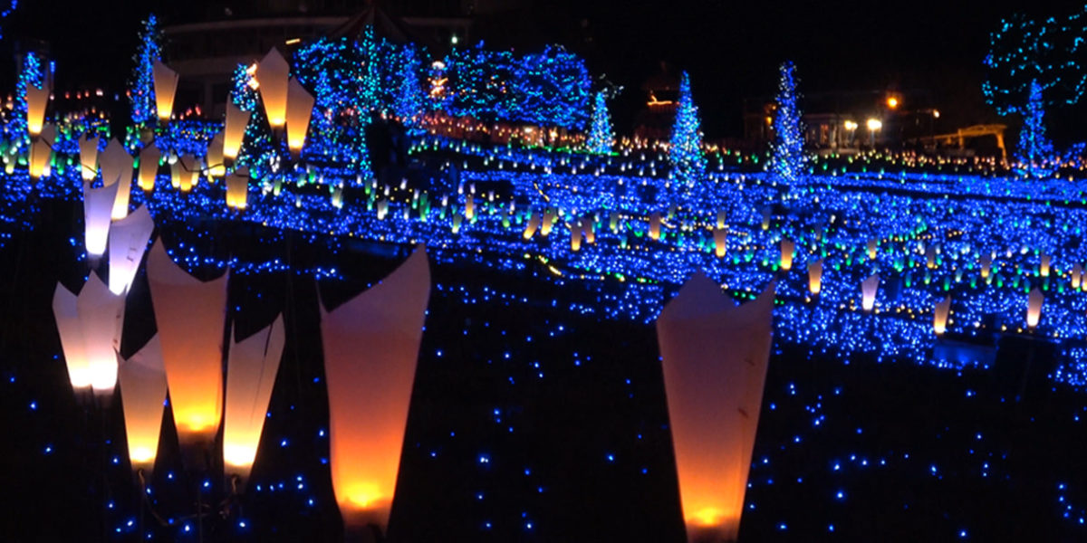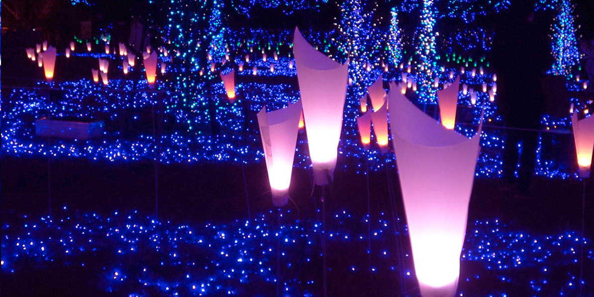 壮大な丘陵広場一面に、フルカラーの光の花を設置。
