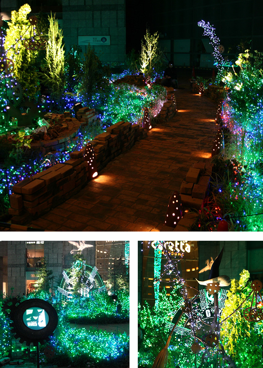 様々な仕掛けを配し、子どもから大人まで楽しむ事の出来るイルミネーションとした。